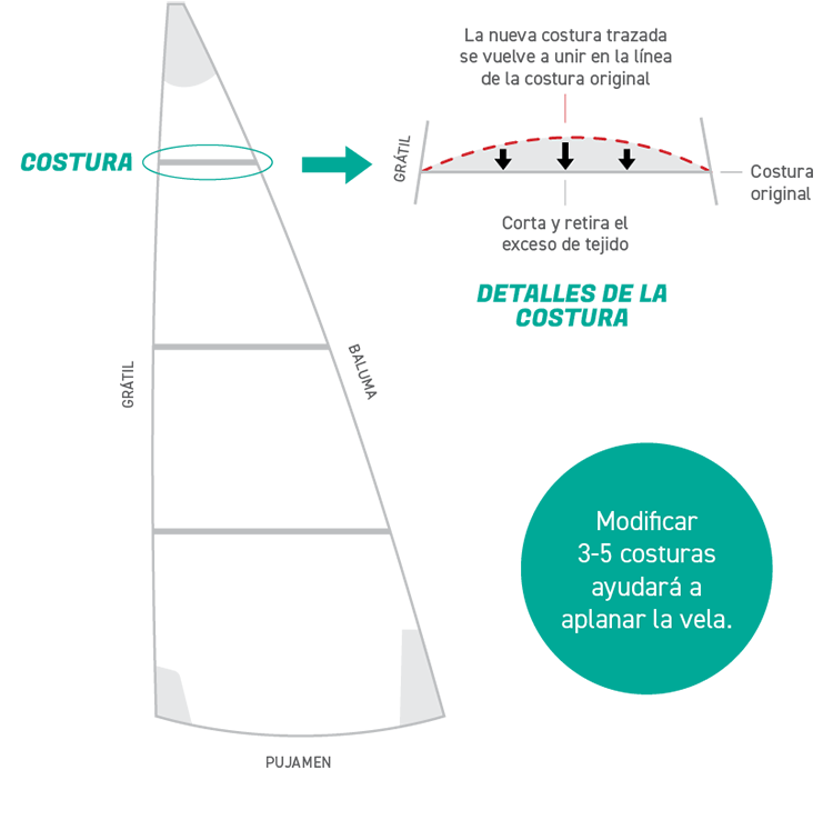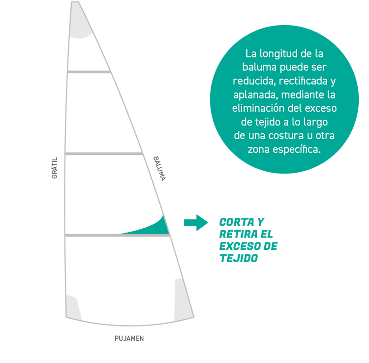 Al eliminar el exceso de tejido en una costura o en cualquier otra sección de la vela, es posible acortar y aplanar la baluma para restaurar sus dimensiones y forma originales./p>