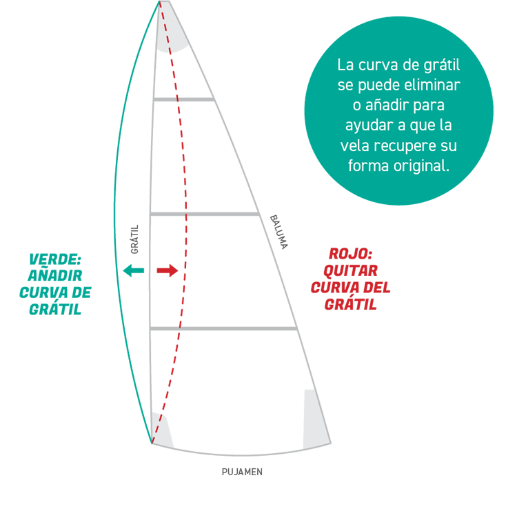 La curva del grátil se puede restaurar para ayudar a que la vela recupere su forma original. A veces se modifica la curva del grátil para reducir la entrada y aplanar la vela.